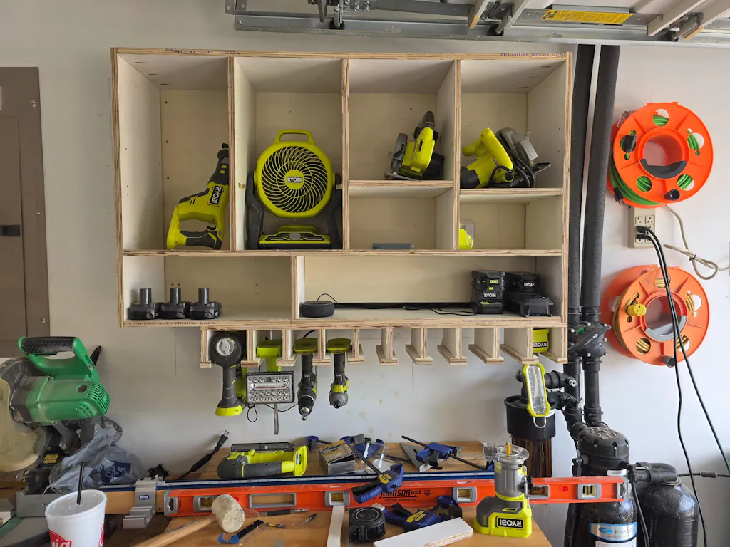 This drill charging station is so much more than that! Not only can it hold all your drills, batteries and chargers but also loads of other tools and supplies you want at your fingertips like sand paper, fasteners and saws.