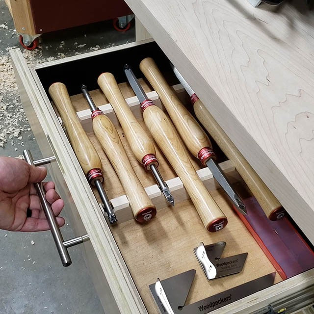 Are you interested in wood turning? Want some shop furniture that's more than just functional? This lathe stand has a 60" top and will fit a midi-lathe with bed extension OR some full sized lathes. There is ample storage for both tools and turning blanks.